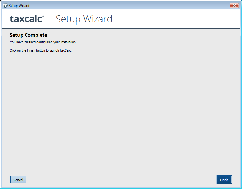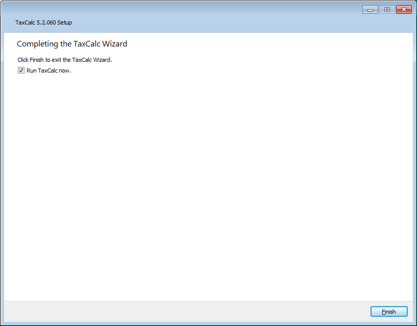 Click Next to continue. You are now shown the final screen in the initial setup. Run TaxCalc now should be checked.