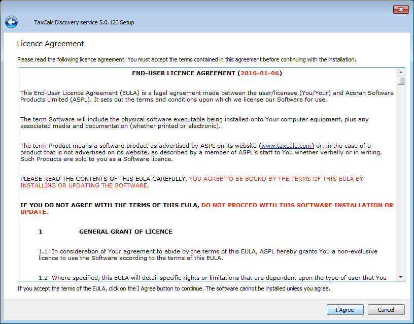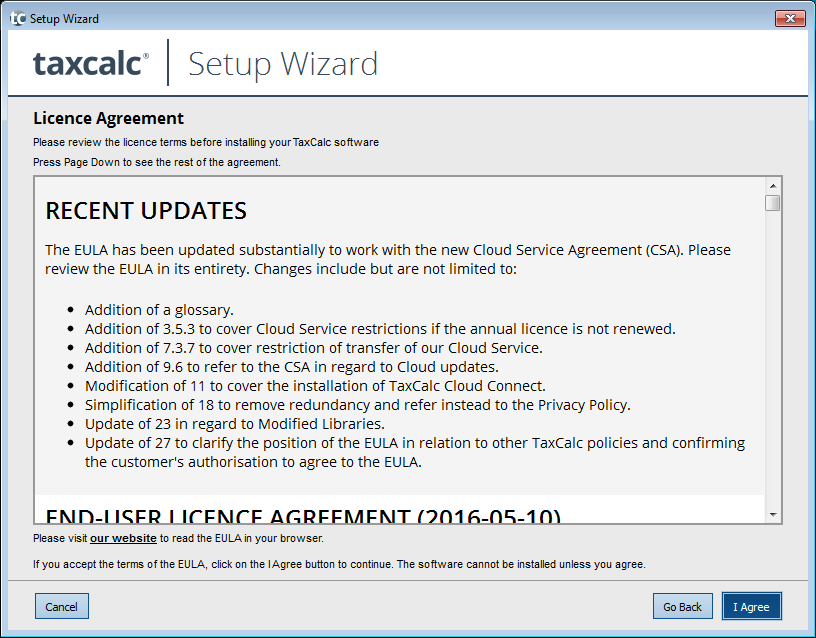 Click Next to continue. Users will now be presented with the Licence Agreement. You need to click I Agree in order to continue. If you require more information about the End-User Licence Agreement (EULA) this can be found at http://www.taxcalc.com/eula (where copies of all of our EULAs and policies can be found).