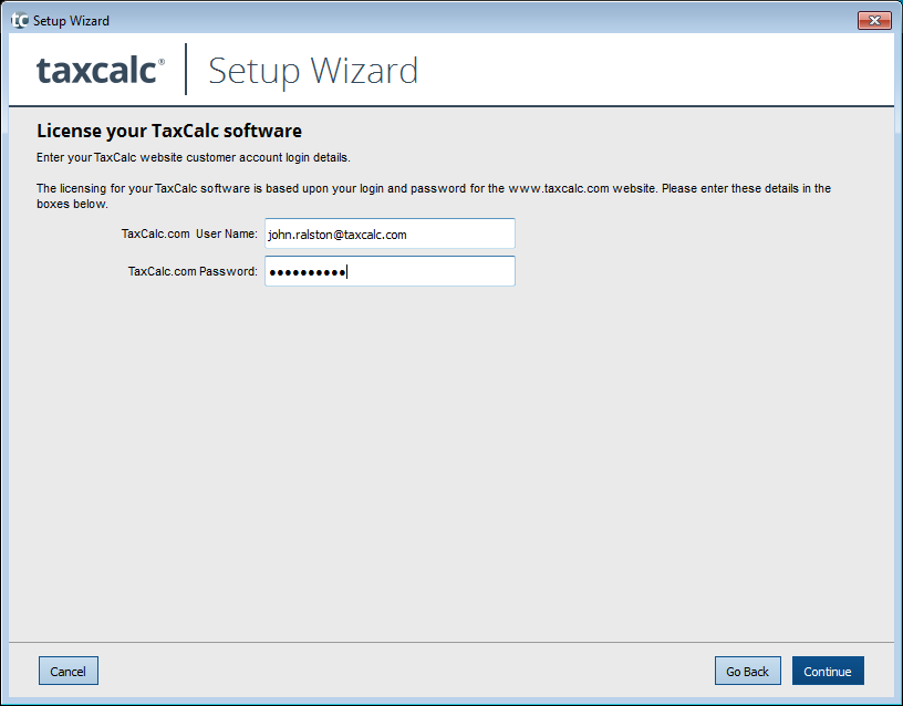 Click I Agree to continue. In order to allow TaxCalc to run it must be licensed. Enter your website customer account details at this point. This is normally in the form of an email and password. Please note: Users who have configured the Advanced Security option can use the secondary account login to download and configure the software. See What is Advanced Security? for more details.