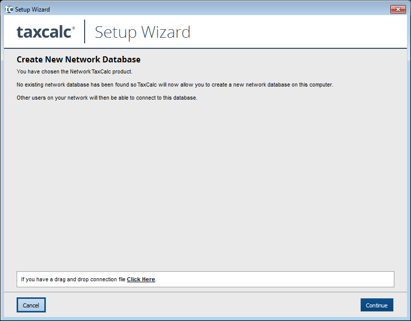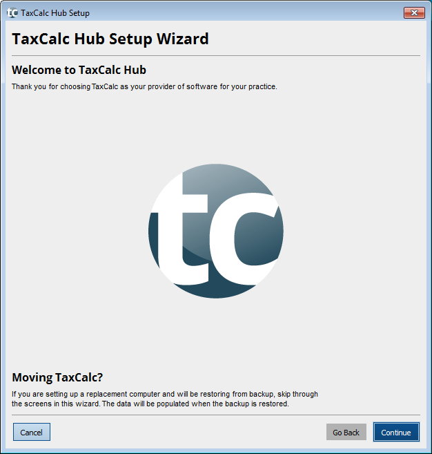 Once the database has been created, the TaxCalc Hub Setup Wizard will be shown. STEP 4: Configuring the database on the serverThe TaxCalc Hub Setup Wizard allows you to personalize the installation of TaxCalc to your requirements. |