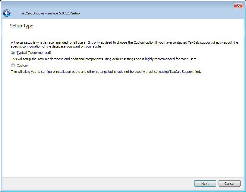 Click Next to continue. The next screen allows you to select Typical or Custom install routines. It is highly recommended you choose the Typical option. Only choose Custom if you are aware of the implications and you have read the Performing a custom installation of TaxCalc (advanced users only) article beforehand.