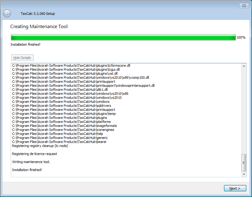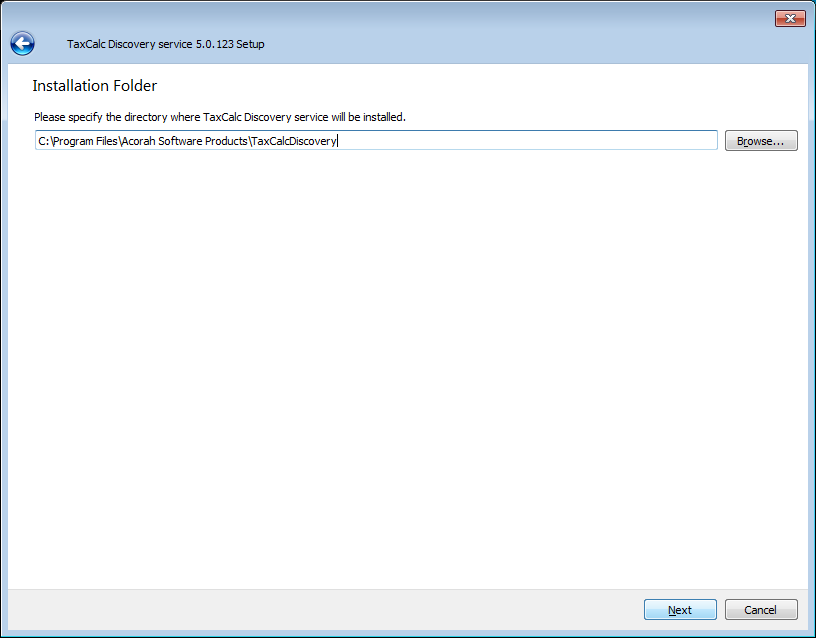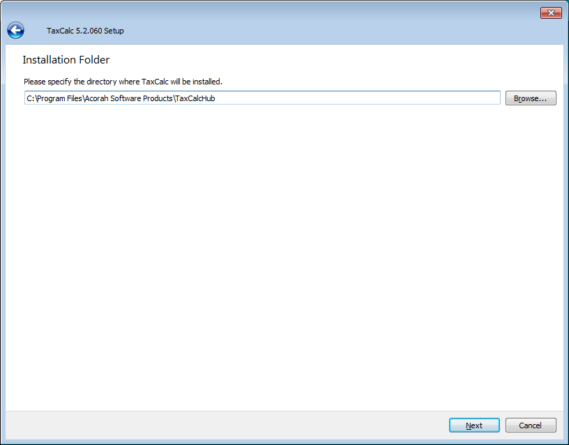 Click Next to start the installation process. You are now prompted for the installation path for TaxCalc. It is recommended that you leave this path at the default. If you wish to perform a custom installation, please ensure you know the implications of doing so. More information on custom installations can be found at Performing a custom installation of TaxCalc (advanced users only).