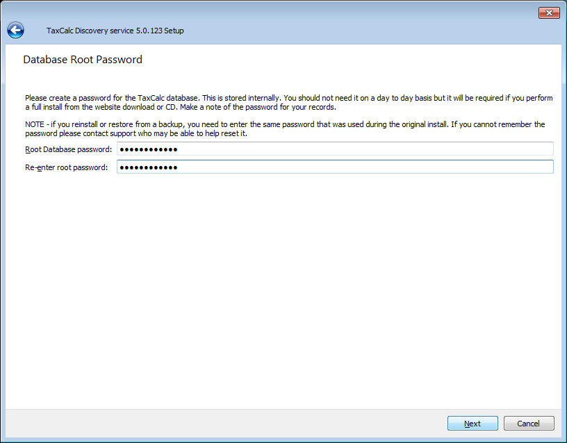 Click Next when you have entered and repeated the password. Please note: The root database password is required to restore a database, perform database admin tasks or reinstall the program. You must make sure you are able to enter the password if required. Do not lose it!