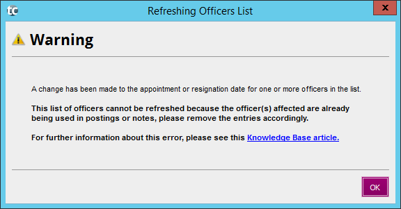 In instances where changes are made to relationships within Practice Manager, if an accounting period already exists, you will need to force a refresh for these changes to take place on the financial statements. To do this, you will need to go to the Officers page within Client Information and click on the Refresh List button. If you have any entries (notes or postings) where any of the director's are associated, you will get a message as below: