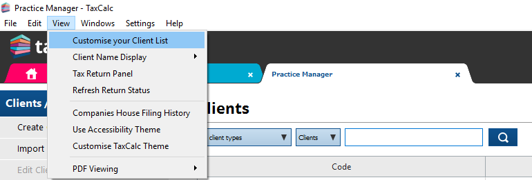 3. Select Customise your Client List from the drop-down menu.