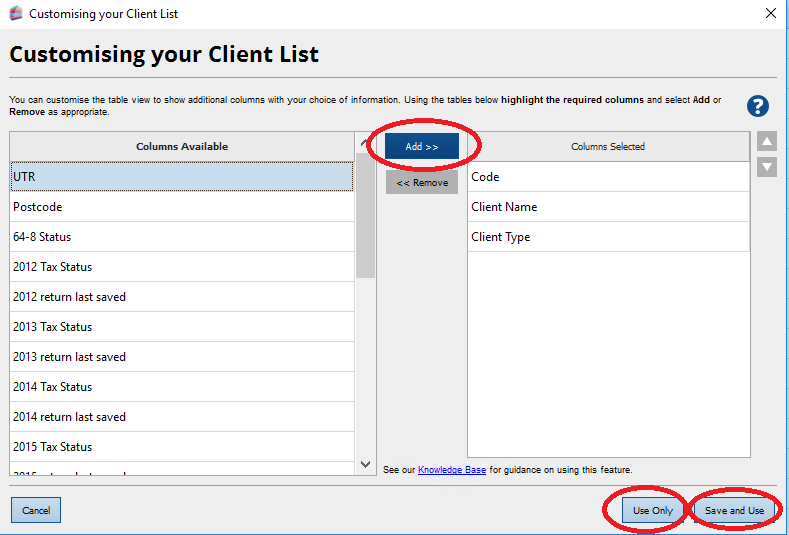 4. In the Customising your Client List window, highlight the relevant Tax Status column under Columns Available and click on Add > >