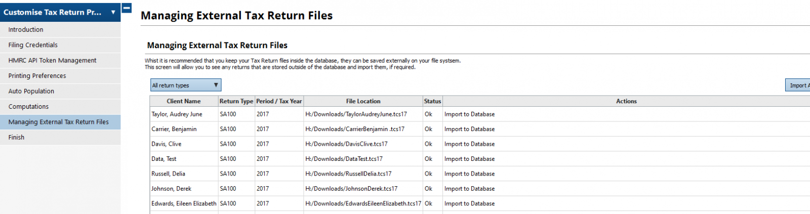 TaxCalc defaults the tax returns to be stored in the central database. However files can be stored externally but we do not recommend this as it may cause potential duplication of data, particularly if running a network version. It is possible to import external files directly into Practice Manager. Simply follow the steps below: