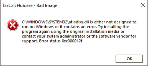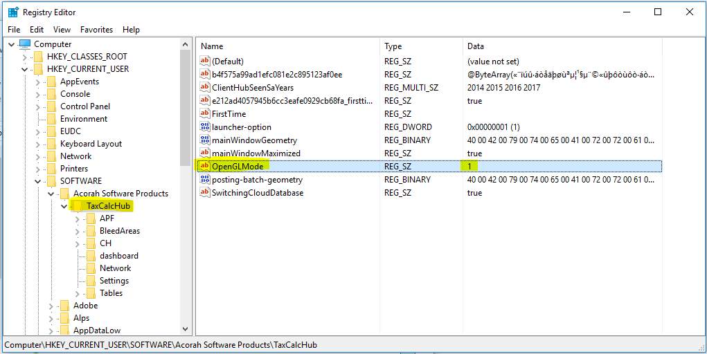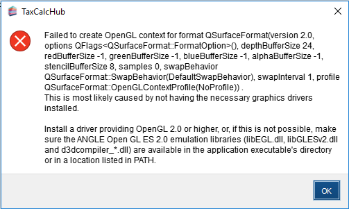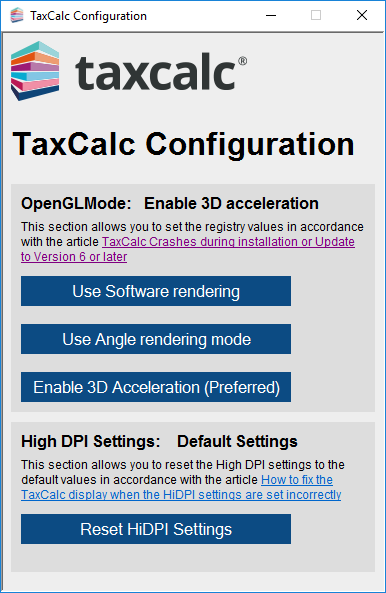For security and functionality reasons, TaxCalc have upgraded some of the components used in the program. In a small number of cases the graphics drivers used on some machines can cause unexpected issues, and one of the following errors may occur when installing, updating or running the software: To correct this error an entry needs to be made in the TaxCalc specific part of the registry, to configure the way your computer uses the OpenGL component for TaxCalc. There are three ways to make this change,