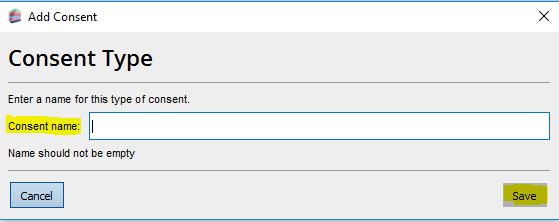 Step 4: Enter consent name > Save. Changes will apply after you click on Finish > Finish and Save > Close Admin > Re-open.