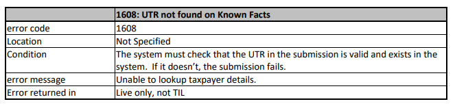 When receiving the error message 1608 Unable to lookup taxpayer details, this means that HMRC are unable to process their checks required to pass the UTR entered. This could mean it has been incorrectly entered on the return, the UTR no longer exists (if a company has been dissolved) or if you have entered a UTR for another HMRC service. You will need to contact HMRC to ensure that the UTR entered is correct and to advise how to proceed.