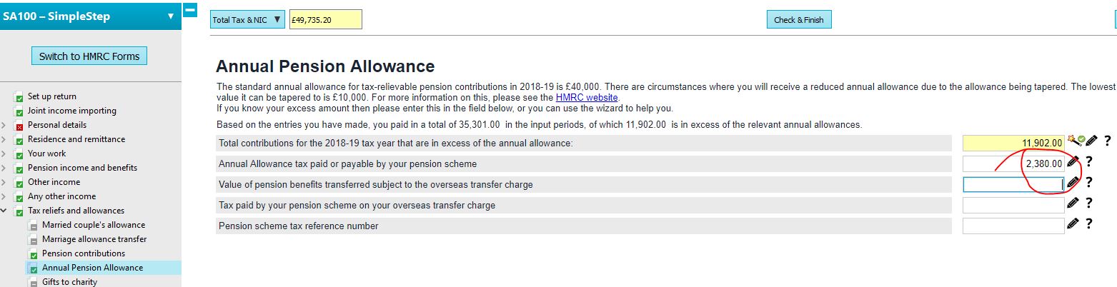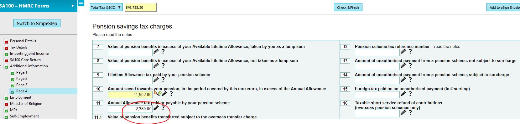 HMRC have identified an issue whereby the Annual Allowance (pension) Charge calculated, is not always correct for Scottish rate taxpayers. The calculation is not correct for Scottish rate taxpayers where the tax charged should be at the Scottish intermediate rate (21%-2018/19)) rather than the Scottish higher rate (41%-2018/19). If the taxpayer is liable to pay the charge, HMRC advises a workaround to add an amount within Annual Allowance tax paid to reduce the pension charge to the expected amount. For example, if the excess contributions are £11,902 and the pension charge has been incorrectly calculated @ 41% = £4,879, and the correct amount should be @ 21% = £2,499, the difference to enter in amount paid is £2,380. Enter the amount as follows: HMRC Forms mode > Page Ai4 > box 11 SimpleStep mode > Tax reliefs and allowances > Annual Pension Allowance > Annual Allowance tax paid or payable by your pension scheme.