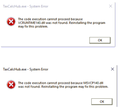 If the following messages appear when trying to run the TaxCalc application for the first time on a new Windows 10 PC, the below steps can be used to fix the issue: