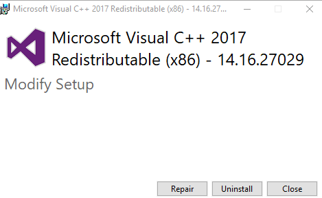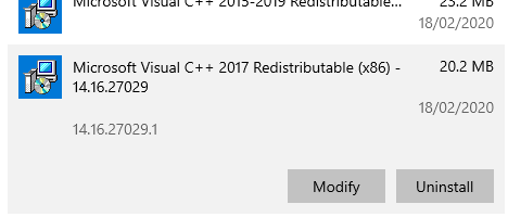 2 - Locate the most recent 'Microsoft Visual C++ 20XX Redistributable (x86)' from the list, then click 'Modify':