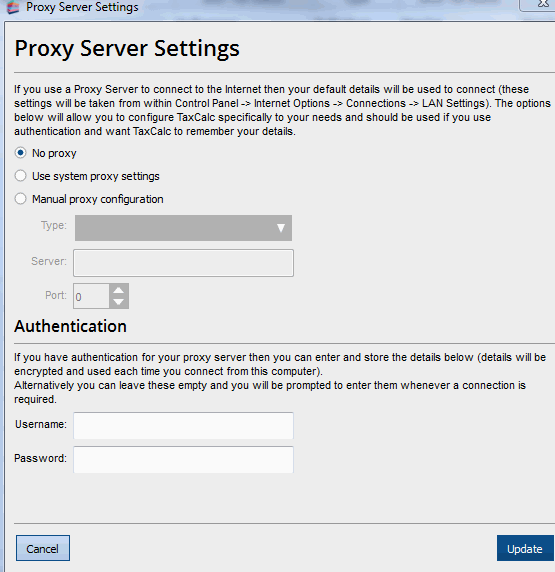 Is the connection to the TaxCalc server working?Exit and then restart TaxCalc. From the top menu bar, go to Help > Check for updates. Success: 'Your software is up to date' or the update appears under notifications. Run the update and then proceed to the next step. Failure: 'Unable to retrieve product version/Couldn't resolve hostname/Null response'. Check your proxy server: